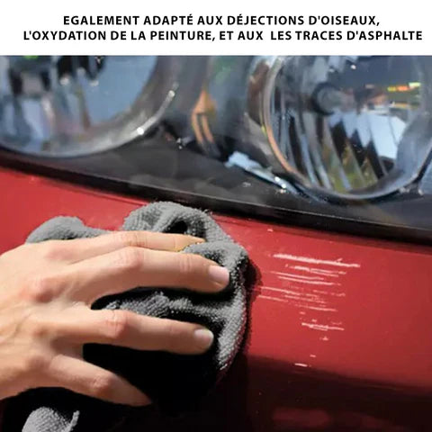 Il saura vous débarrasser des rayures légères notamment près des poignées de vos portes, causées par exemple par vos clés ou vos bijoux. Le chiffon intelligent n'est pas seulement composé d'un abrasif. Il regroupe également un agent de polissage et des huiles minérales. Le produit se répend pour restaurer la brillance de la carrosserie. À noter que les couleurs foncée demandent plus de précaution lors de l'utilisation. Trop de force dans le geste pourrait entraîner une décoloration. Remettez le tissu dans son sachet après utilisation. Il peut-être utilisé environ 10 à 15 fois.